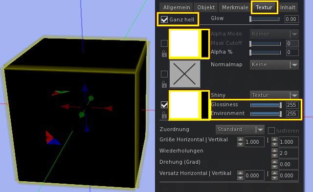 - Für den Würfel "Ganz hell" (Full Bright) aktivieren.