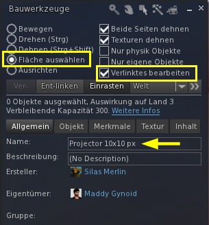 Projektorwürfel mit Strg + Alt + T sichtbar machen - Nun im Baufenster im oberen Bereich die beiden Optionen "Fläche auswählen" und "Verlinktes bearbeiten" aktivieren. So heißt es bei mir im Black Dragon. Keine Ahnung, wie es in anderen Viewern heißt. Mit diesen Optionen kann man innerhalb der verlinkten Gruppe des Projektorwürfels sowohl ein einzelnes Prim als auch die angeklickte Fläche dieses Prims auswählen.