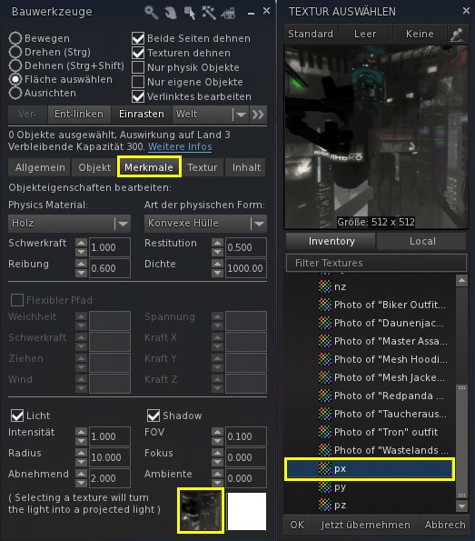 - Anschließend wechselt man zur Registerkarte "Eigenschaften" (in meinem Viewer heißt sie "Merkmale"). Dort klickt man unten auf das linke Texturfeld für Projektoren und wählt im Texturauswahlfenster die Textur mit dem Namen aus, die den letzten beiden Buchstaben aus dem Namen der Würfelfläche entspricht. Also hier im Beispiel "px".