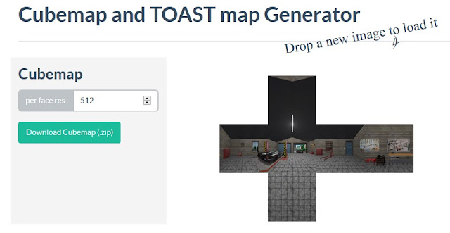 Das gespeicherte 360 Grad Foto aus dem Viewer, muss dann für den Einsatz im Projektorwürfel aufbereitet werden. Dazu den Cubemap and TOAST map Generator aufrufen und das 360 Grad Foto auf das kreuzförmige Feld ziehen. Man braucht von diesem Generator nur die Cubemap und nicht die TOAST map. Die Auflösung habe ich bei mir dann auf 512 eingestellt. Für einen Spiegel bis etwa zwei Meter Kantenlänge reicht das aus. Zum Schluss auf "Download Cubemap (.zip)" klicken, um das Ergebnis auf Festplatte abzuspeichern.