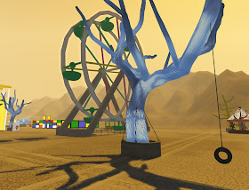 Desweiteren ist ein kleiner Rummelplatz aufgebaut, mit Riesenrad, Autoscooter und Karusell. Ein besonderer Gag ist das Porta Potty Building. Traditionell gibt es ja auf allen Burning Man / Burn2 Veranstaltungen immer viele Dixi Toiletten (der amerikanische Marktführer heißt halt Porta Potty). Diese sind aber alle für menschliche Avatare ausgelegt. Heute sollen nun in einem kleinen Wettbewerb Dixi-Klos für nicht-humane Avatare gebastelt werden. Die besten Modelle werden dann im Oktober auf dem großen Burn2 Festival überall in der Wüste aufgestellt.