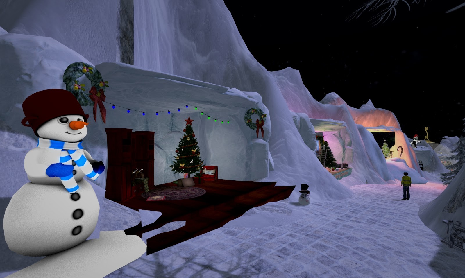 Auf der zweiten Region kann man sich dann mit einem Rentierschlitten über den Sim fahren lassen. Dazu läuft im Landstream klassische Weihnachtsmusik. Der Fruit Islands Sim hat ebenfalls einen großen Eislaufsee mit einer sehr hellen Eisfläche. Hier wird man tatsächlich etwas Schneeblind, wenn man als Windlight eine Mittagseinstellung wählt. Geht man in die Höhle, die direkt am See durch den Berg führt, ist aber wiederum ein helleres Windlight besser, weil es dann auch nach Eis aussieht.