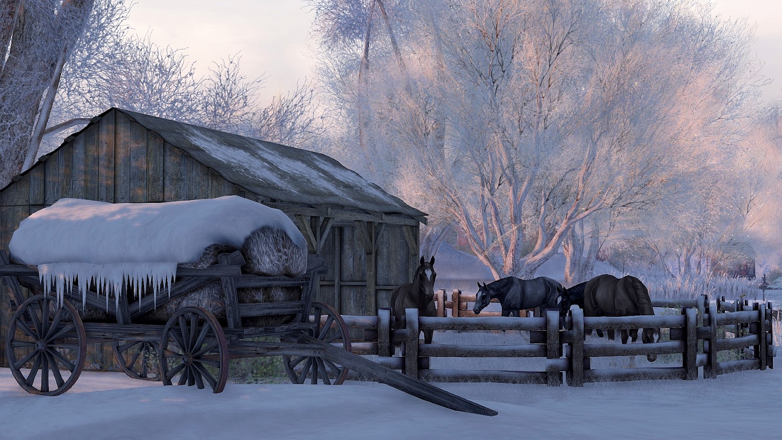 So richtig an das alte Frisland erinnert, hat mich nur die rote Kapelle und der Pferdestall mit dem Gatter. Bei der Kapelle ist auch ein sehr lokales Schneetreiben gerezzt worden. Das hätte man durchaus etwas großflächiger auf der Region ausbreiten können. Denn wie mein nächstes Foto zeigt, erzeugt es bei Motiven eine winterlichere Atmosphäre als auf dem Rest der Region.