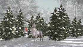 Was mir gegenüber dem Herbst aufgefallen ist, war die deutliche Aufstockung der im Wald herumstehenden Hirsche. Das sind nun mehr als zehn, was man fast schon als Herde bezeichnen könnte. Und es gibt zwei große Elche mit riesigem Geweih. Die habe ich dort zum ersten Mal in Second Life gesehen. Vielleicht habe ich deshalb unbewusst gleich beide auf einem Foto festgehalten.