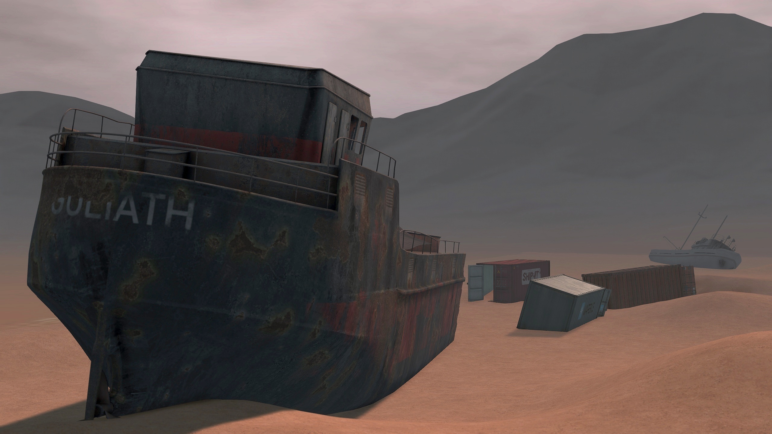 Im Wesentlichen lässt sich die Gestaltung in vier Bereiche einordnen. Wüstenboden mit Autowracks, Wüstenboden mit Ruinen, Wüstenboden mit riesigen Totenköpfen und ein kleines Habitat, in dem noch einige Menschen leben. Das Ganze natürlich auch auf dem Wüstenboden.^^
